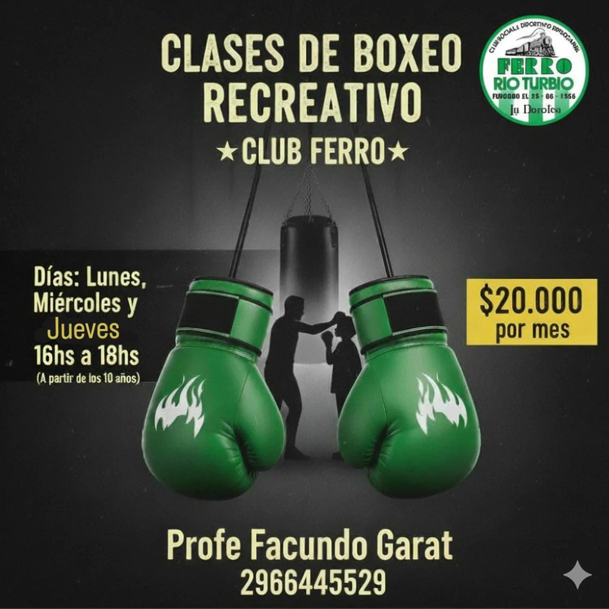Se realizarán clases de Boxeo Recreativo, a cargo de Facundo Garat, quien abrirá este nuevo taller en el Club Ferro los días lunes, miércoles y jueves de 16:00 a 18:00, para personas a partir de los 10 años.