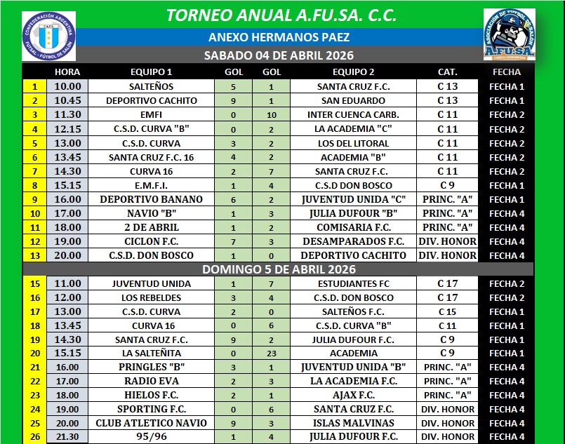 Este fin de semana se disputó una nueva jornada del torneo anual de futsal de Afusa Cuenca Carbonífera, con actividad desarrollada en el Anexo Hermanos Páez de la localidad de 28 de Noviembre. La acción se llevó adelante durante el sábado 4 y domingo 5 de abril, con una gran convocatoria de equipos y público.