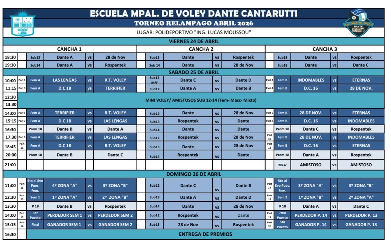 La actividad comenzó el día viernes y se extenderá hasta este domingo, con competencia en categorías mayores tanto en la rama femenina como masculina. Además, el evento incluye participación de divisiones formativas como sub-12, sub-13 y sub-14, sumando también encuentros de minivóley que le dan un marco integral a la propuesta deportiva.