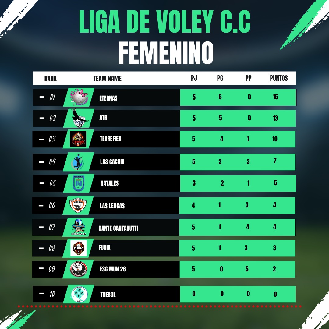 En cuanto a la tabla de posiciones, en la rama femenina el equipo Eternas lidera con 15 puntos, seguido por ATR con 13 unidades, mientras que Terrefier completa el podio con 10 puntos.