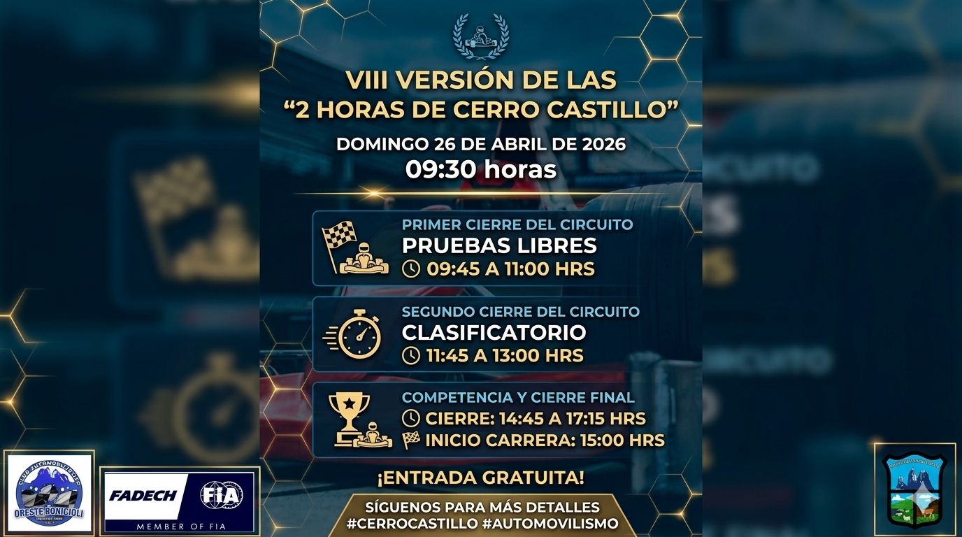 Con un trazado exigente y la participación de pilotos de la región, las 2 Horas de Cerro Castillo prometen una jornada a pura velocidad en uno de los escenarios más imponentes del sur patagónico.